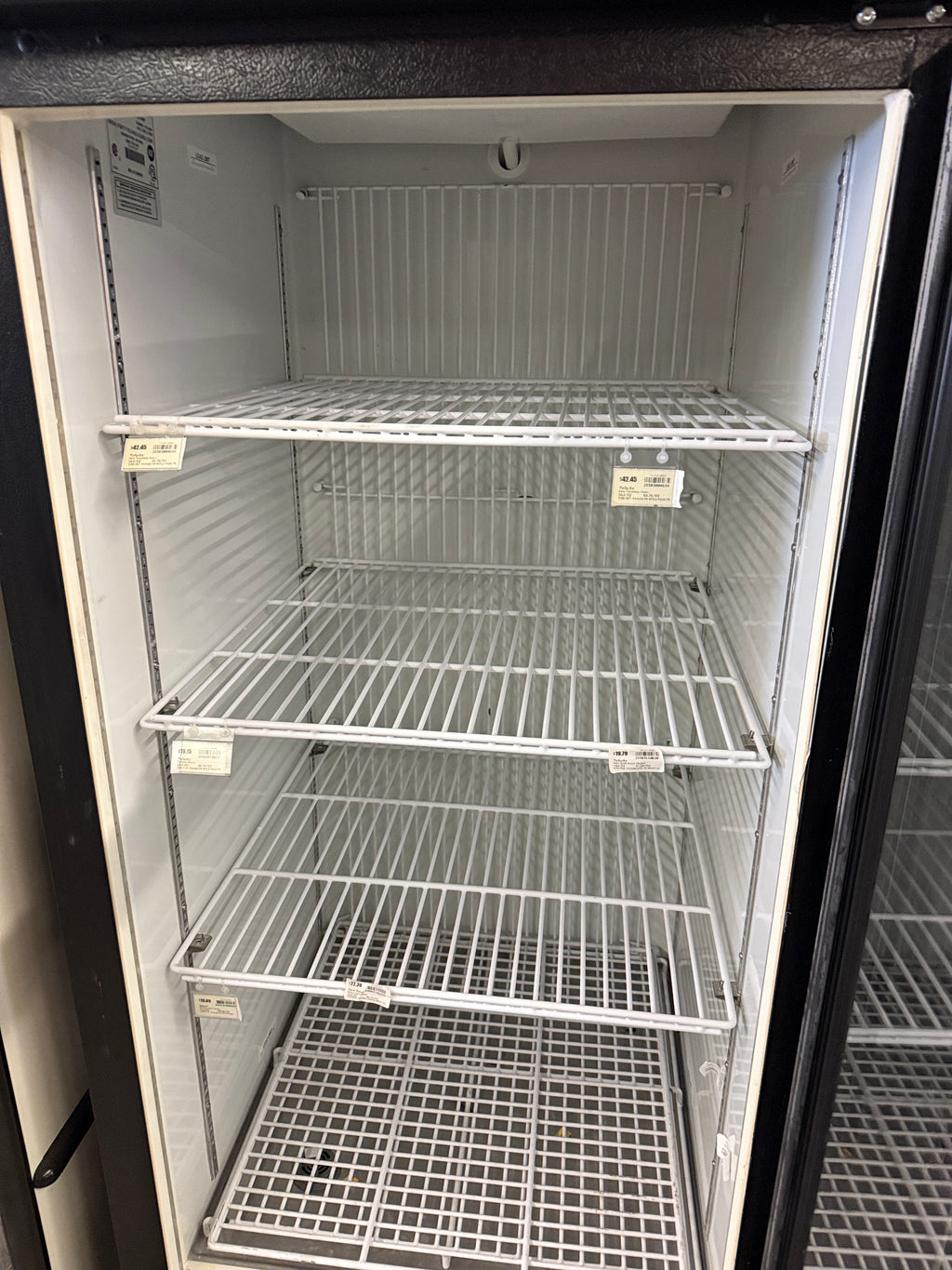 The Minus Forty 22-USGF freezer merchandiser includes a right-hinged, full-height glass door paired with LED lighting and a backlit translight header for enhanced visibility. This 30-inch-wide by 33 4⁄5-inch-deep by 78 3⁄4-inch-high cabinet combines a bold black exterior with a white interior for contrast in retail displays. Its adjustable shelving system includes four repositionable tiers and a coated base shelf for added corrosion resistance.